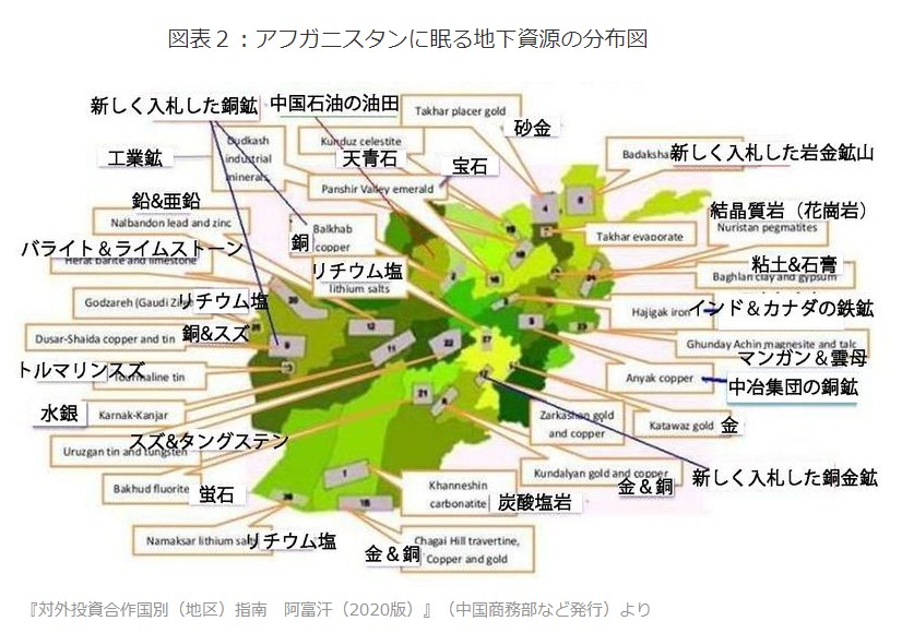前述の中国商務部を中心とした「報告書」にあるアフガン地下資源分布と開発現状のマップには、「五鉱集団」ではなく、「中冶集団」の企業名があることから、このマップは少なくとも2016年以前の情報に基づいていることが分かる。