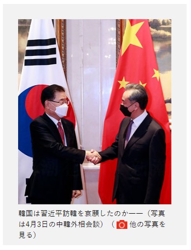 4月3日の中韓外相会談で、韓国は習近平訪韓を哀願したと思われます。韓国外交部の発表には「中国側は習近平主席の訪韓意思を改めて表明し、双方は習主席の訪韓がコロナ19の状況が安定し状況が整い次第、早急に実現するよう積極的に意思疎通するとした」とあります。