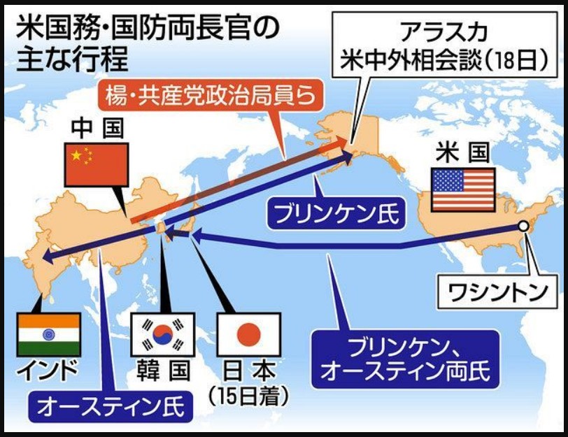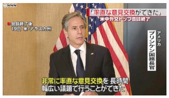 『異例の非難合戦で幕を開けた米国と中国の外交トップによる2日間の協議が19日、終了した。人権や経済で同盟国と組んで中国封じ込めを狙う米国と、軍事や内政で強権を誇示する中国。超大国の衝突は政治体制や国家理念にも立ち入る新たな次元に突入した。