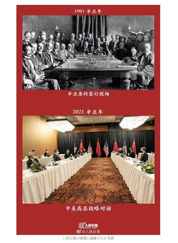 初日の協議後、共産党機関紙の人民日報系メディアが「拡散」した写真が中国のSNS(交流サイト)で話題を呼んだ。1901年に西洋列強の8カ国連合が義和団の乱を受けて当時の清朝に北京議定書を結ばせる場面と、今回の米中協議を比較したものだ。