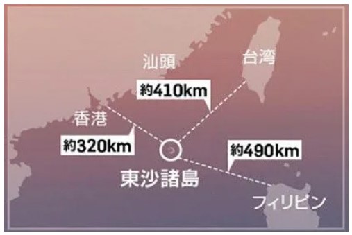 (中略)東沙は地理的に中国沿岸から近く、台湾本島からは距離がある。台湾本島からは約410キロあるが、広東省の汕頭(スワトウ)からは約260キロしかない。