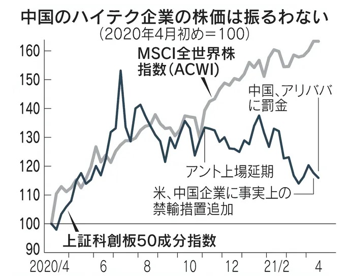 株価も振るわない。科創板の主要上場企業50社で構成する「上証科創板50成分指数」は足元では1300を下回り、20年夏の高値から3割近く下回って推移する。世界株全体の値動きを示す「MSCI全世界株指数(ACWI)」が上昇を続けるのと対照的な値動きとなっている。