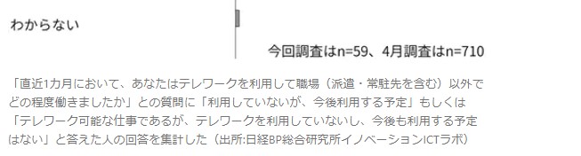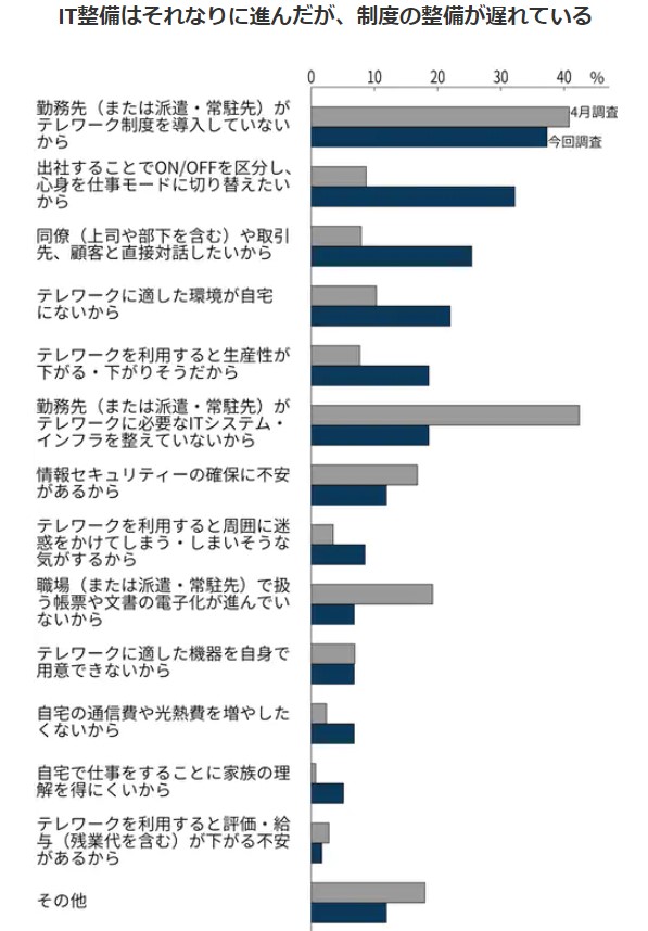 この2つの回答からは、テレワークに移行しても従来と同じように業務を進める必要があったため、通常よりも業務の幅を狭めるケースが多かった可能性があるという。