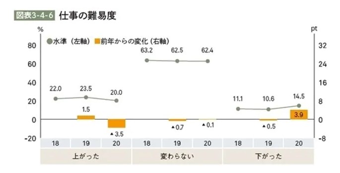 学習・訓練の指標のうち「自ら学んでいる(自己啓発)」も19年の27.0ポイントから20年には26.1ポイントまで減った。この背景として、孫研究員は2つの回答の関連性に注目しているという。具体的には、「仕事の難易度が下がった」という回答が増えていることと、「単調ではなく、様々な仕事を担当した」が減っていることとの関連性だ。
