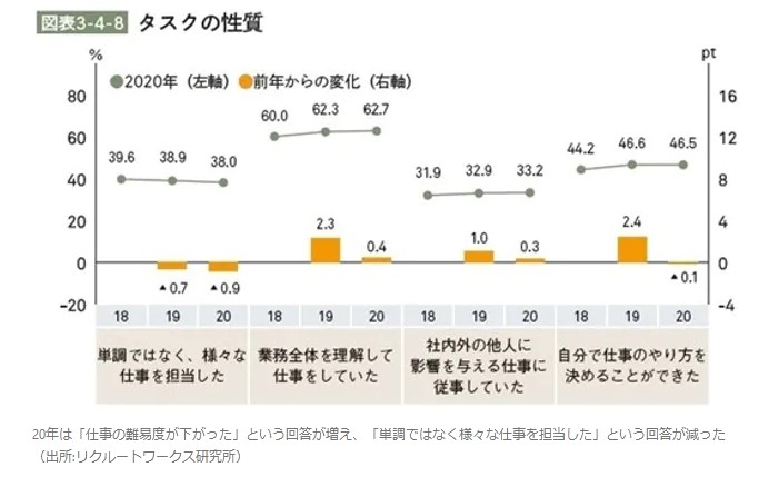 20年は「仕事の難易度が下がった」という回答が増え、「単調ではなく様々な仕事を担当した」という回答が減った(出所:リクルートワークス研究所)