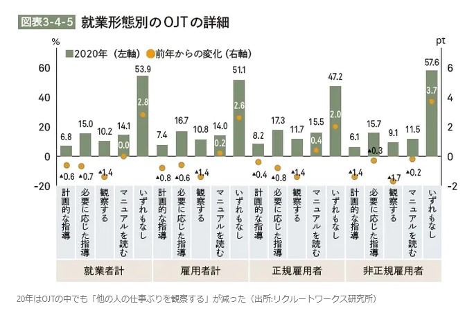 学習・訓練の指標を細かく分析すると、20年はOJT(職場内訓練)の機会が19年と比べて1.9ポイント低下していた。OJTの種類には「(上司による)計画的な指導」「必要に応じた指導」など複数あるが、その中でも「(上司や先輩などから指導を受けてはいないが、他の人の仕事ぶりを)観察する(ことで新しい知識や技術を身に付ける)」の減り方が最も大きかった。