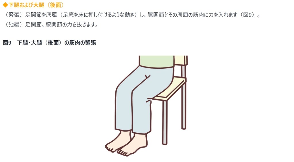 ◆下腿および大腿(後面) (緊張)足関節を底屈(足底を床に押し付けるような動き)し、膝関節とその周囲の筋肉に力を入れます(図9)。 (弛緩)足関節、膝関節の力を抜きます。