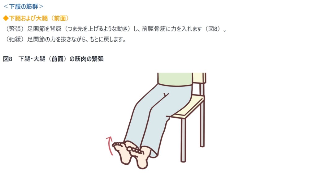 <下肢の筋群> ◆下腿および大腿(前面) (緊張)足関節を背屈(つま先を上げるような動き)し、前脛骨筋に力を入れます(図8)。 (弛緩)足関節の力を抜きながら、もとに戻します。