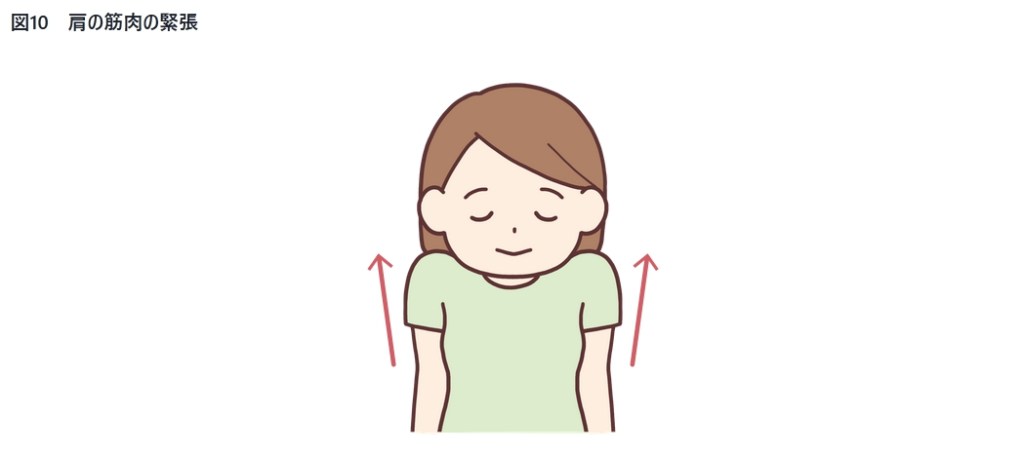 <肩・頸部の筋群> ◆肩 (緊張)両肩を挙上し、首をすくめるような姿勢をとりながら、筋肉(僧帽筋、肩甲挙筋)に力を入れます(図10)。 (弛緩)両肩を下ろします。