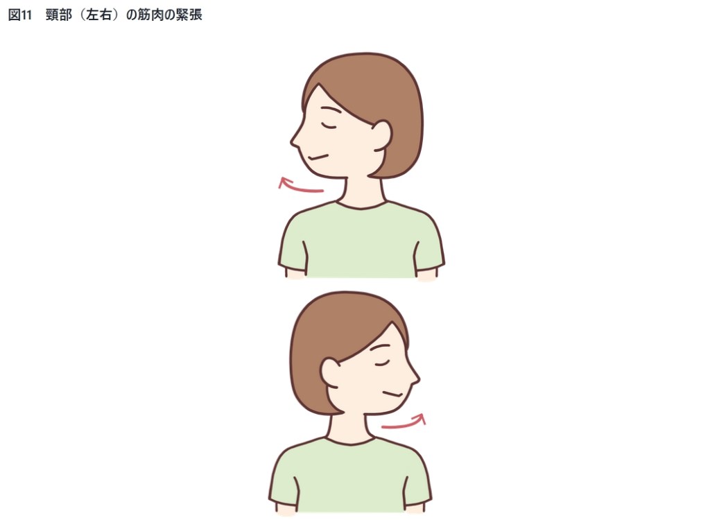 ◆頸部(左右)(図11) (緊張)頭部を右側に回し、左側の筋肉(胸鎖乳突筋を含む頸筋群)を緊張させます。 (弛緩)首の位置をもとに戻します。 (緊張)頭部を左側に回し、右側の筋肉(胸鎖乳突筋を含む頸筋群)を緊張させます。 (弛緩)首の位置をもとに戻します。