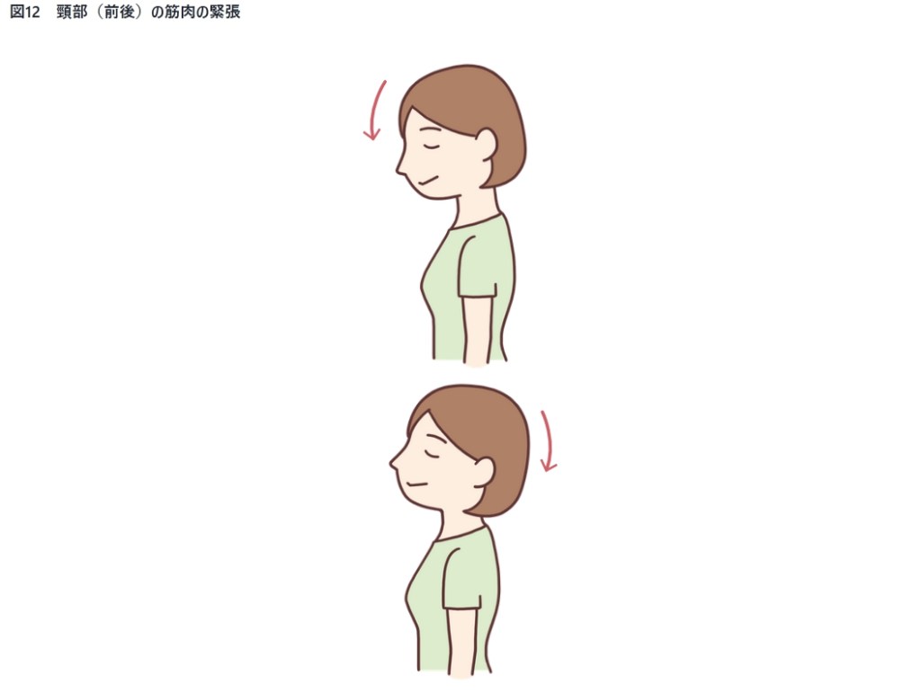 ◆頸部(前後)(図12) (緊張)頸部を前屈し、喉周辺の筋肉(胸鎖乳突筋を含む頸筋群)を緊張させます。 (弛緩)首の位置をもとに戻します。 (緊張)頸部を後屈し、後頸部の筋肉(胸鎖乳突筋を含む頸筋群)を緊張させます。 (弛緩)首の位置をもとに戻します。