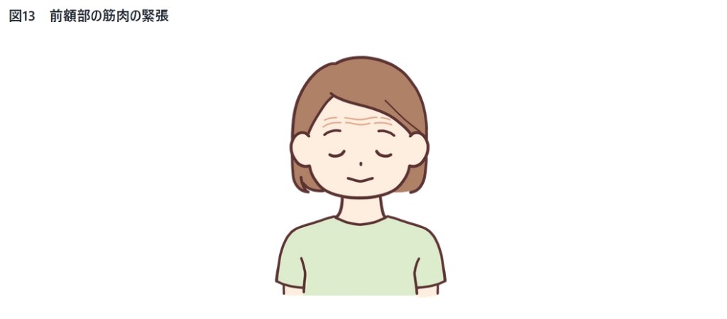 <顔の筋群> ◆前額部 (緊張)軽く閉眼し、額の筋肉(前頭筋)にしわを寄せるように動かします(図13)。 (弛緩)もとに戻します。 (緊張)軽く閉眼し、眉を上げるように前頭筋を動かします。 (弛緩)もとに戻します。