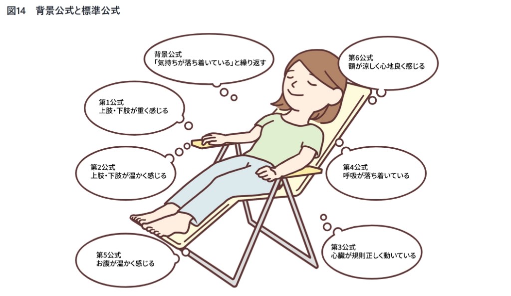 「安定して落ち着いている状態」を感じ取る<背景公式>と、それぞれの部位に自己暗示を行い、内的体験をする6つの<標準公式>を確認しながら進めます(図14)。