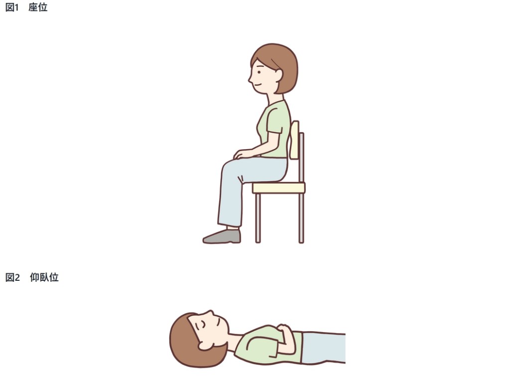①衣服を緩ませ、時計や装飾品など、身体を締め付けるものは外します。 ②椅子での座位、背もたれ椅子での半座位、仰臥位など、心地よい姿勢をとります。このとき、両上肢は膝の上に置く、または身体から少し離して力を抜き、リラックスした状態にします。 ③1つの公式を5~6回繰り返します。
