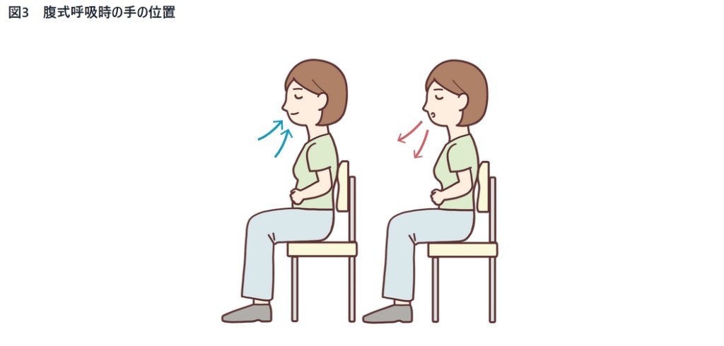 ②呼吸する際の身体状況がわかるように、手の位置を決めます。膝の上や腹部など、どこに置いてもよいですが、座位、仰臥位ともに、臍部付近に手を当てると呼吸を意識しやすくなります(図3)。