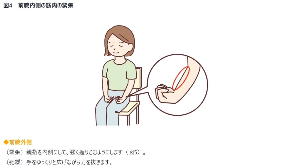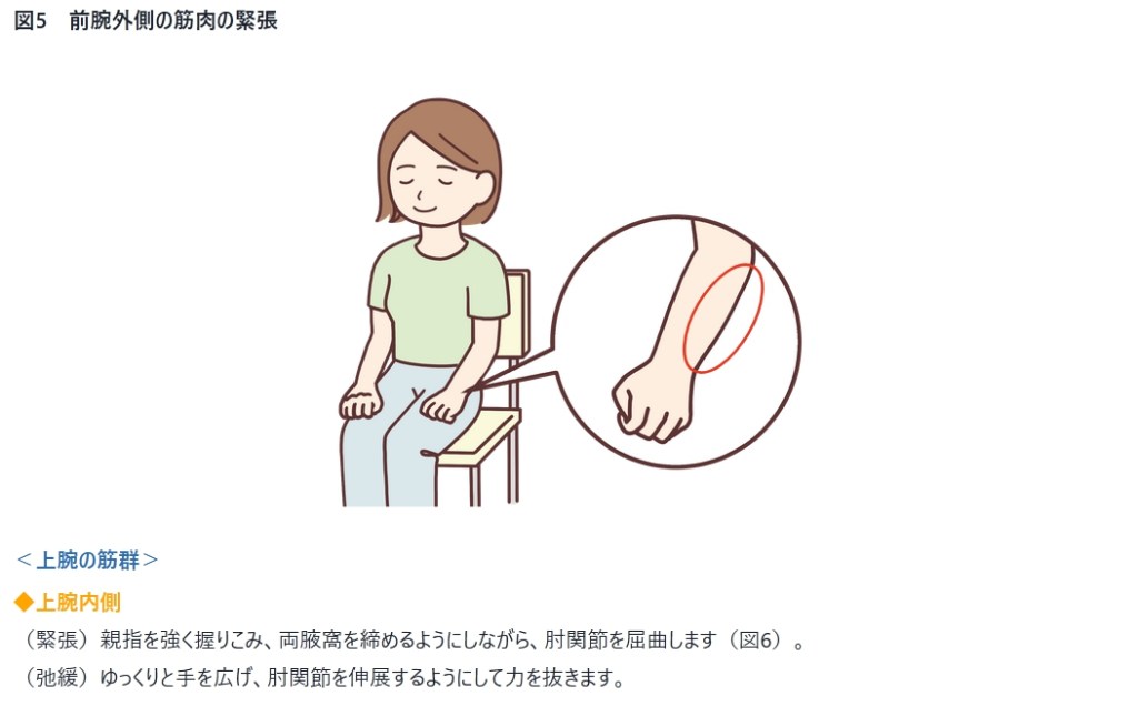 ◆前腕外側 (緊張)親指を内側にして、強く握りこむようにします(図5)。 (弛緩)手をゆっくりと広げながら力を抜きます。