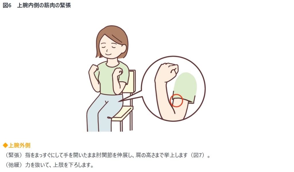 ◆上腕外側 (緊張)指をまっすぐにして手を開いたまま肘関節を伸展し、肩の高さまで挙上します(図7)。 (弛緩)力を抜いて、上肢を下ろします。