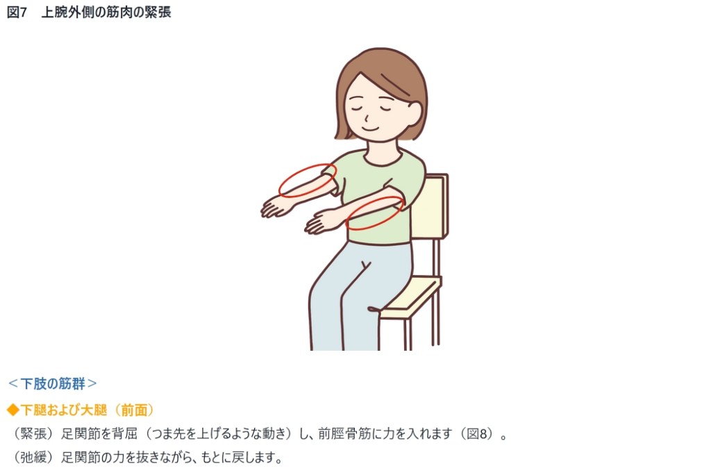 ●実施する筋群は、両上肢、両下肢、頸部・胸部、顔のような枠組みに分けられ、練習しながら、実施する部位を広げていきます。 ●例えば、前腕や上腕で実施する場合、基本的に、「利き手→反対の手」「両上肢」の順で行いますが、両方の部位から開始することもあります。順番は実施者に合わせるとよいでしょう。 ●筋肉の動きとしては、緊張と緩和を繰り返します。 ●緊張させる時間より、弛緩させる時間を長くして、無理のないリズムで実施します。目安として、緊張が7~10秒、弛緩が10~20秒です。 実施方法(部位別)