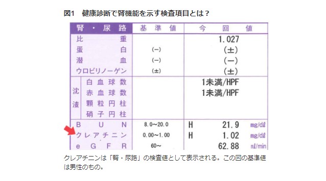 クレアチニンは筋肉の老廃物のような物質で、本来は腎臓でろ過され、尿とともに排出される。腎臓のろ過機能が落ちれば、ろ過しきれなかったクレアチニンが血液中に残ってしまう。血液中のクレアチニン(血清クレアチニン)の数値が高くなれば、腎機能が落ちたことが疑われるわけだ。