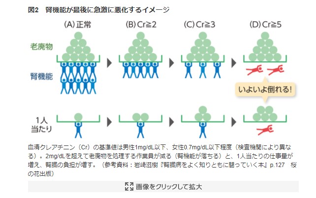 「1日8時間労働で残業ゼロの人が、仕事量が2倍に増えて16時間労働になっても、何とかこなせば仕事は残りません。でも、仕事量がさらに増えて限界に達して倒れてしまうと、急に大量の仕事がたくさん残ってしまいます。それと同じことが、血清クレアチニンが『突然に増えた』ように見えるときに起こっているのです」(岩崎医師)