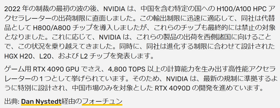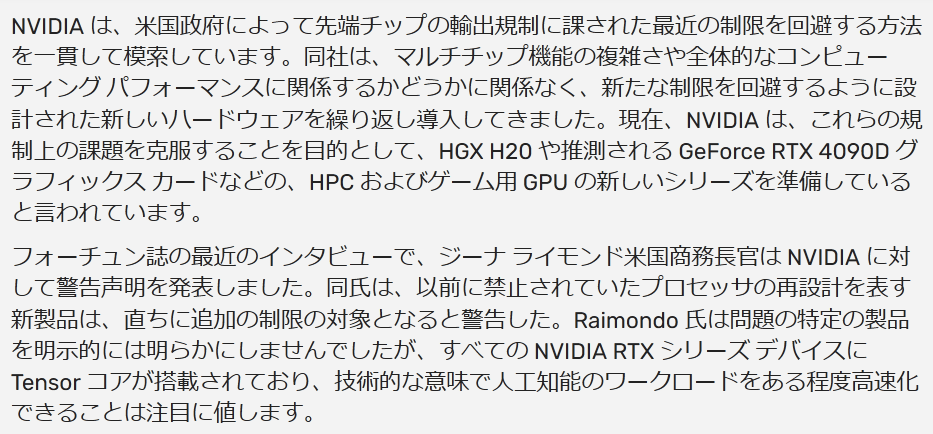 「NVIDIA は、米国政府と緊密に協力して、その規制に準拠した製品を開発してきました。」