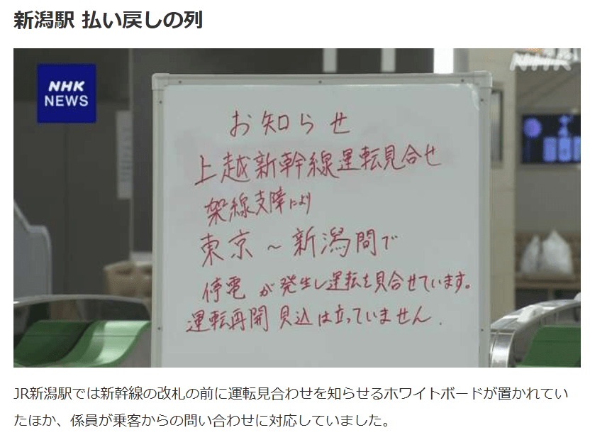 また別の男性は「きのう仕事で東京から新潟に入って商談をし、きょう午前中に帰ろうと思っていました。雪が心配だったので早めの新幹線を予約しましたがこういう状況で帰れません。東京でも商談があったが、すでに先方に連絡してキャンセルしました。もう1泊するか考えています」と話していました。