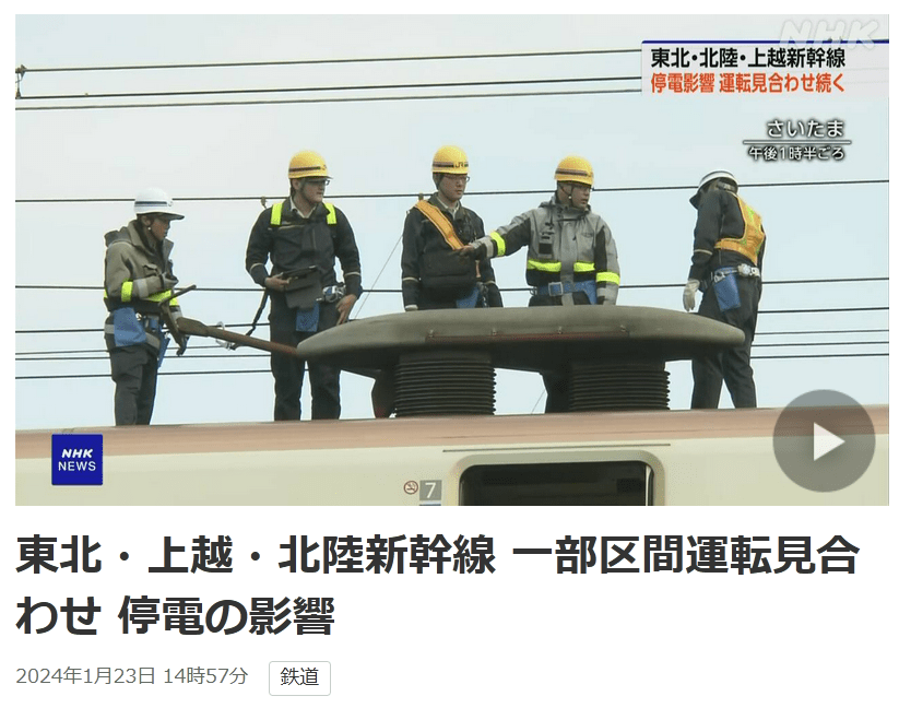 JR東日本によりますと、23日午前9時58分ごろ、東北新幹線、北陸新幹線、上越新幹線で停電が発生し、係員が確認したところ上野駅と大宮駅の間の上りで架線が垂れ下がっているのが確認されました。