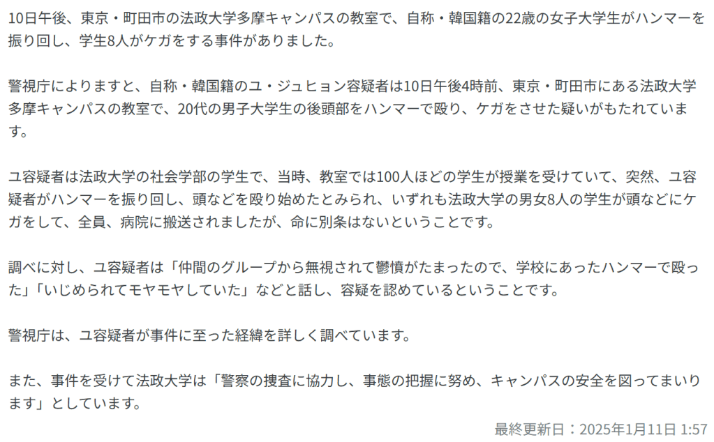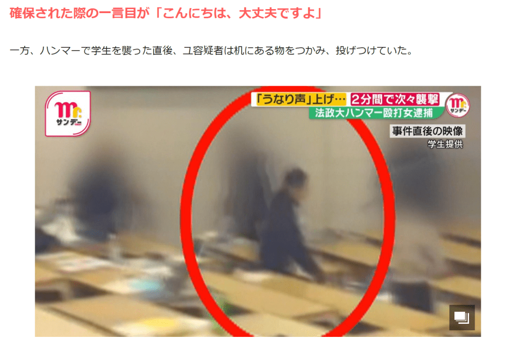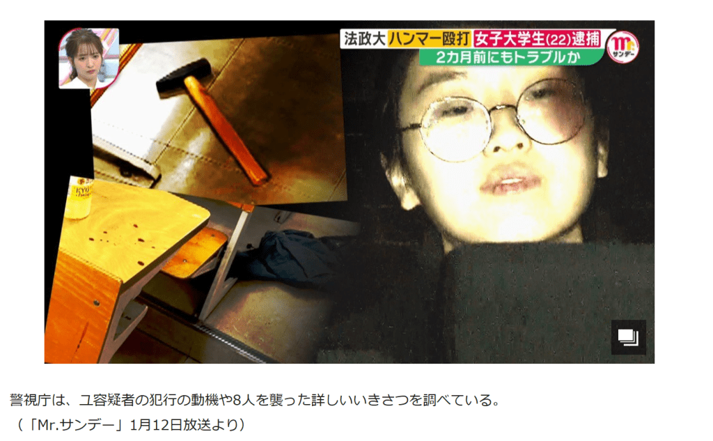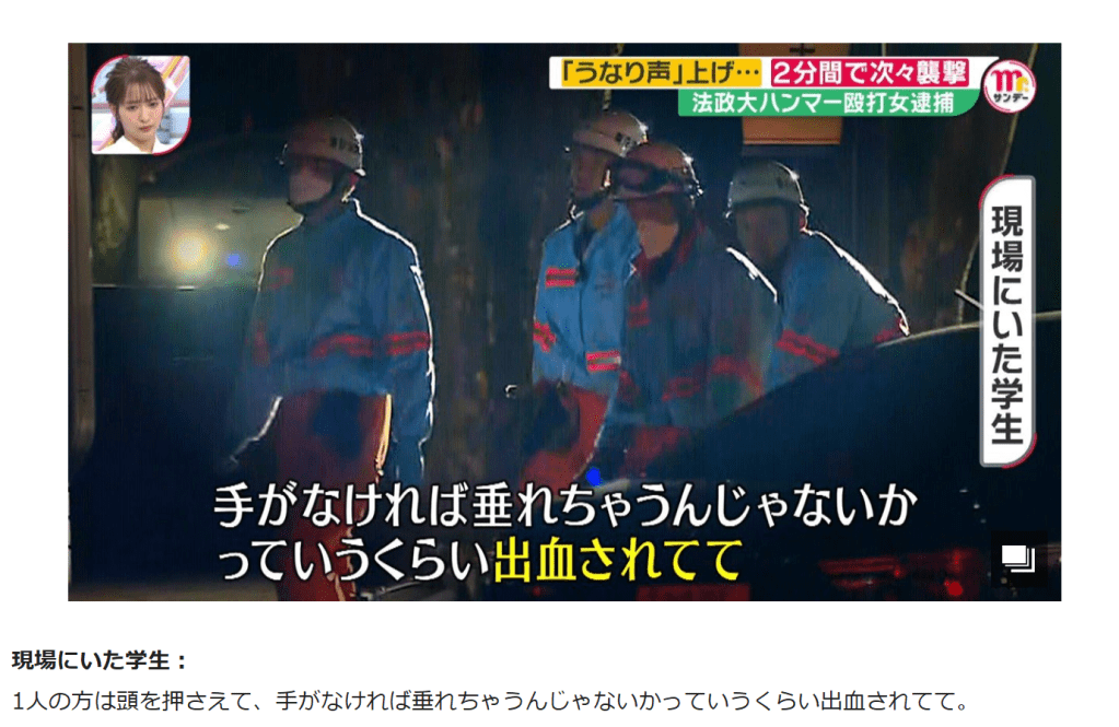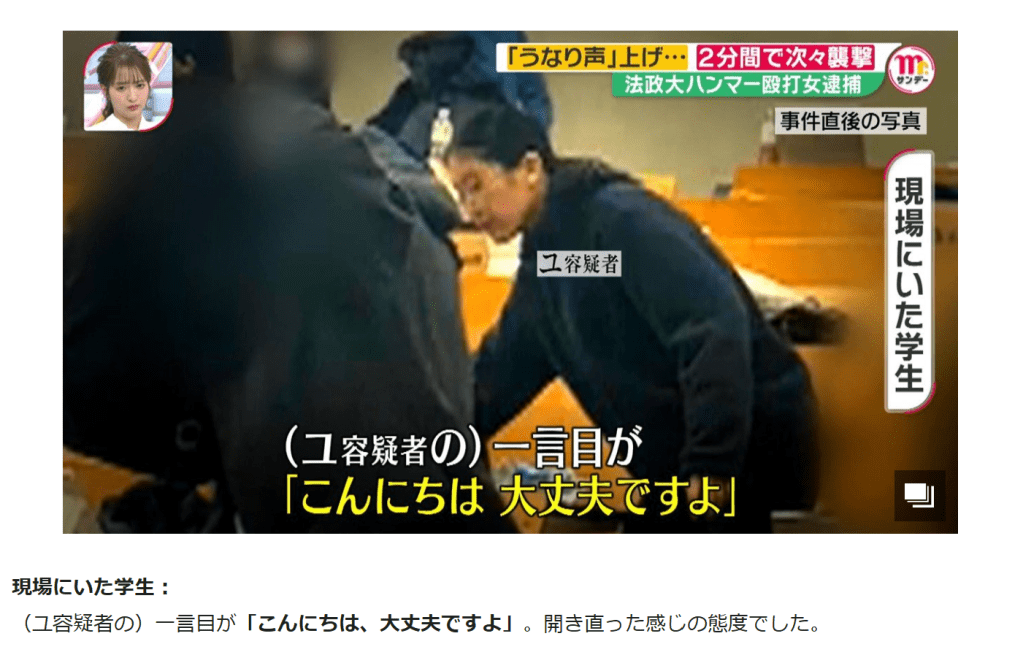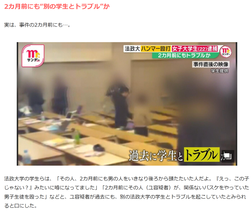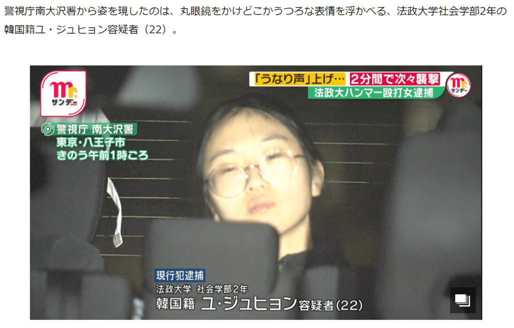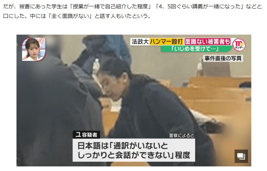 法政大学の学生らは、「その人、2カ月前にも男の人をいきなり後ろから頭たたいた人だよ。『えっ、この子じゃない?』みたいに噂になってました」「2カ月前にその人(ユ容疑者)が、関係ないバスケをやっていた男子生徒を殴った」などと、ユ容疑者が過去にも、別の法政大学の学生とトラブルを起こしていたとみられると口にした。