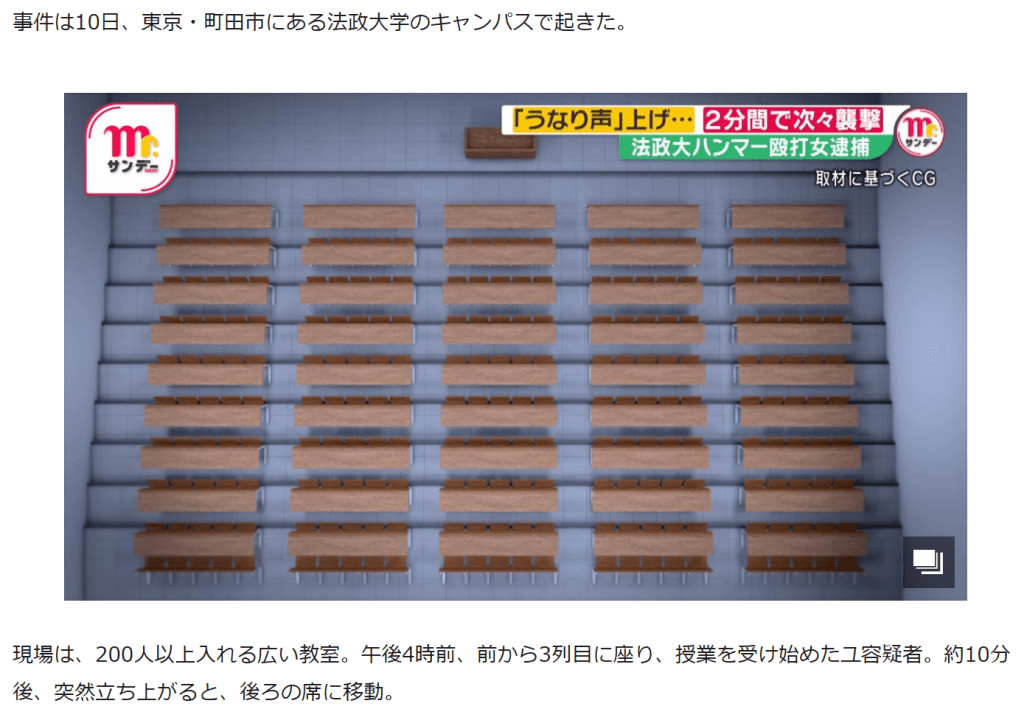 現場は、200人以上入れる広い教室。午後4時前、前から3列目に座り、授業を受け始めたユ容疑者。約10分後、突然立ち上がると、後ろの席に移動。