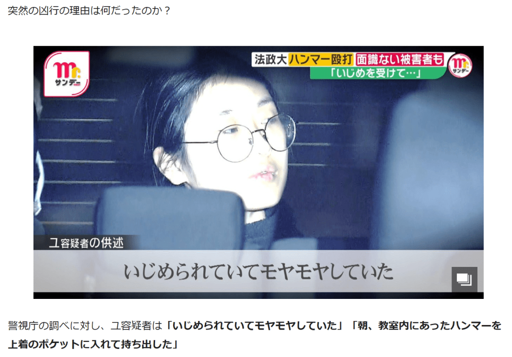 警視庁の調べに対し、ユ容疑者は「いじめられていてモヤモヤしていた」「朝、教室内にあったハンマーを上着のポケットに入れて持ち出した」