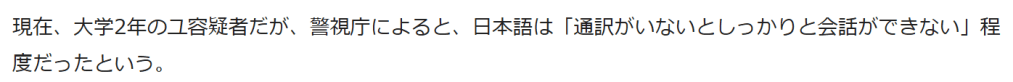 現在、大学2年のユ容疑者だが、警視庁によると、日本語は「通訳がいないとしっかりと会話ができない」程度だったという。