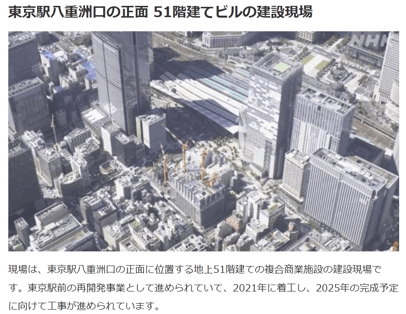 現場は、東京駅八重洲口の正面に位置する地上51階建ての複合商業施設の建設現場です。東京駅前の再開発事業として進められていて、2021年に着工し、2025年の完成予定に向けて工事が進められています。