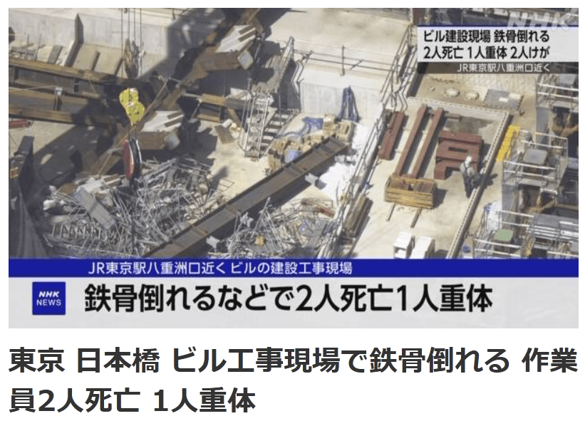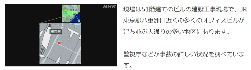 現場は51階建てのビルの建設工事現場で、JR東京駅八重洲口近くの多くのオフィスビルが建ち並ぶ人通りの多い地区にあります。