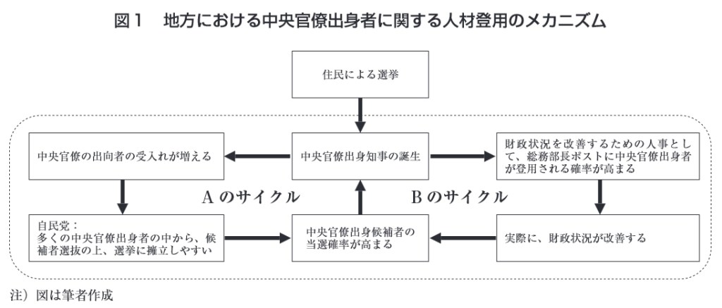 図1では、既存研究の議論を踏まえた上で、 筆者が考える地方における中央官僚出身者に 関する人材登用のメカニズムを概略的に示し た。