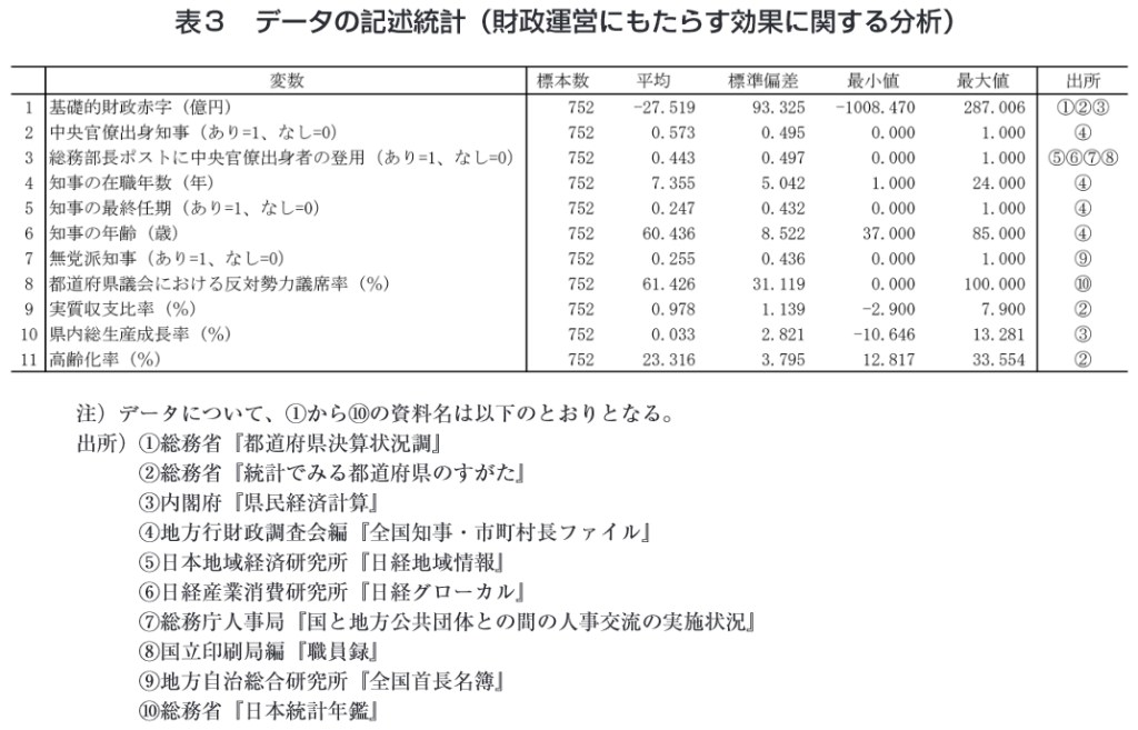 前節で示したように、図1のBのサイクルの (※13)地方における中央官僚の出向人事に関して、データの利用可能性が最も高い資料は、日本地域経済研究所『日 経地域情報』及び日経産業消費研究所『日経グローカル』となるため、本稿の分析ではこれを用いる。この点 については、稲継(2000)や米岡(2020)などでも同様の指摘があるので、あわせて参照されたい。 53 表1 データの記述統計(人材登用に関する分析) 変数 標本数 平均 標準偏差 最小値 最大値 出所 1 総務部長ポストに中央官僚出身者の登用(あり=1、なし=0) 752 0. 443 0. 497 0. 000 1.000 ①②③④ 2 中央官僚出身知事(あり=1、なし=0) 752 0. 573 0. 495 0. 000 1.000 ⑤ 3 歳入総額に占める自主財源割合(%) 752 43. 840 11.848 24. 038 91.930 ⑥ 4 住民一人あたりの歳出総額(対数) 752 12.978 0. 295 12.179 13. 931 ⑥⑦ 5 住民一人あたりの地方債残高(対数) 752 13.492 0. 323 12. 529 14.165 ⑥⑦ 6 自治労組織率(%) 752 57.388 27. 421 0. 000 89. 600 ⑧ 7 職員の平均年齢(歳) 752 42. 999 1.088 40. 000 45. 600 ⑨ 8 経験年数30年以上の大卒職員数(対数) 752 6. 297 0. 469 5. 209 7. 788 ⑨ 9 職員数(対数) 752 8. 609 0. 432 7. 974 10.104 ⑨ 注)データについて、①から⑨の資料名は以下のとおりとなる。 出所)①日本地域経済研究所『日経地域情報』 ② 日経産業消費研究所『日経グローカル』 ③ 総務庁人事局『国と地方公共団体との間の人事交流の実施状況』 ④ 国立印刷局編『職員録』 ⑤ 地方行財政調査会編『全国知事•市町村長ファイル』 ⑥ 総務省『統計でみる都道府県のすがた』 ⑦ 内閣府『県民経済計算』 ⑧ 総務省『職員団体等に関する調』 ⑨ 総務省『地方公務員給与実態調査』