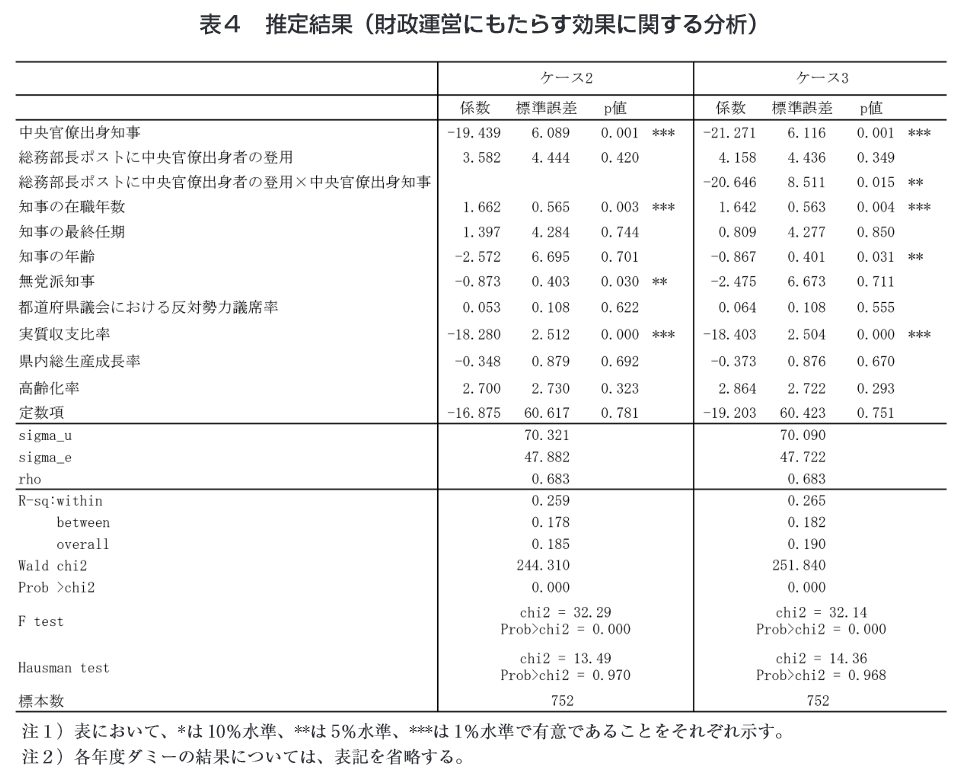 表4 推定結果(財政運営にもたらす効果に関する分析) ケース2 ケース3 係数標準誤差 P値 係数標準誤差 P値 中央官僚出身知事 -19. 439 6. 089 0. 001 *** -21.271 6.116 0.001 *** 総務部長ポストに中央官僚出身者の登用 3. 582 4. 444 0. 420 4.158 4. 436 0. 349 総務部長ポストに中央官僚出身者の登用X中央官僚出身知事 -20.646 8.511 0.015 ** 知事の在職年数 1.662 0. 565 0. 003 *** 1.642 0. 563 0. 004 *** 知事の最終任期 1.397 4. 284 0. 744 0. 809 4. 277 0. 850 知事の年齢 -2. 572 6. 695 0. 701 -0. 867 0. 401 0. 031 ** 無党派知事 -0. 873 0. 403 0. 030 ** -2. 475 6. 673 0. 711 都道府県議会における反対勢力議席率 0. 053 0.108 0. 622 0. 064 0.108 0. 555 実質収支比率 -18. 280 2. 512 0. 000 *** -18. 403 2. 504 0. 000 *** 県内総生産成長率 -0. 348 0. 879 0. 692 -0. 373 0. 876 0. 670 高齢化率 2. 700 2. 730 0. 323 2. 864 2. 722 0. 293 定数項 -16.875 60.617 0.781 -19. 203 60. 423 0. 751 sigma_u 70. 321 70. 090 sigma_e 47. 882 47. 722 rho 0. 683 0. 683 R-sq:within 0. 259 0. 265 between 0.178 0.182 overall 0.185 0.190 Wald chi2 244. 310 251.840 Prob >chi2 0. 000 0. 000 chi2 二 32. 29 chi2 二 32.14 F test Prob>chi2 二 0. 000 Prob>chi2 = 0. 000 chi2 二13. 49 chi2 =14. 36 Hausman test Prob>chi2 = 0. 970 Prob>chi2 = 0. 968 標本数 752 752 注1)表において、・は10%水準、・・は5%水準、・*・は1%水準で有意であることをそれぞれ示す。 注2)各年度ダミーの結果については、表記を省略する。