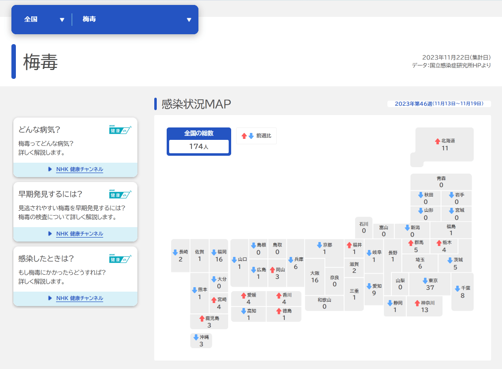 ことし全国から報告された性感染症の梅毒の感染者数は、今月19日の時点で1万3251人となり、去年1年間の1万3228人を上回って、現在の方法で統計を取り始めて以来、最も多くなりました。感染者数は3年連続で過去最多を更新していて、専門家は「リスクのある性行動をとった場合は、感染しているかもしれないと考えて検査を受けてほしい」と呼びかけています。