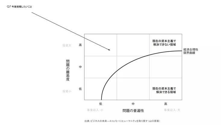そして縦軸は、問題が難しければ難しいほど必要な投資額が大きくなる。現在の資本主義活動のなかでは、必然的に「経済合理性限界曲線」という線の内側しか解決できなくなる傾向にあります。