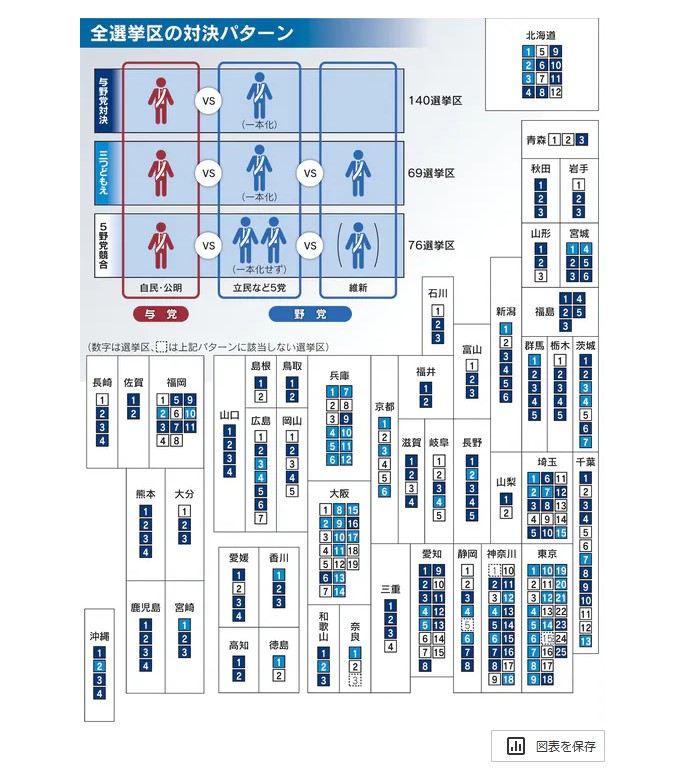 野党間で一本化できず、与党の候補に複数の5党候補が並び立つ「5野党競合」型は76選挙区ある。このうち23選挙区には維新の候補者もいる。野党候補が乱立するほど与党批判票が分散する。