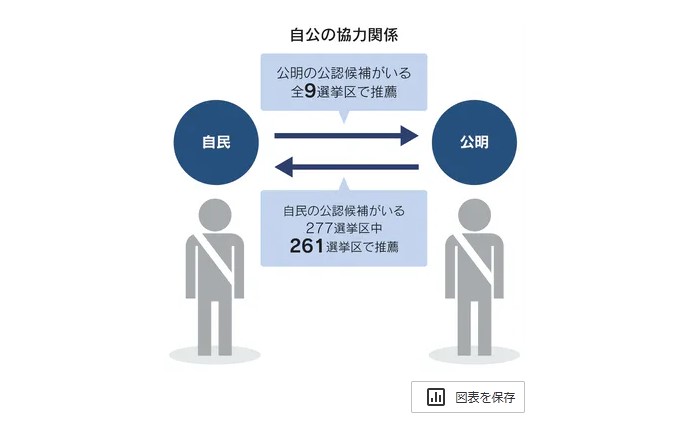 与党はほとんどの選挙区で自民、公明両党が協力する選挙戦になる。自公は1999年に連立政権の樹立で合意し、2009~12年の野党転落時も選挙協力の枠組みを維持してきた。