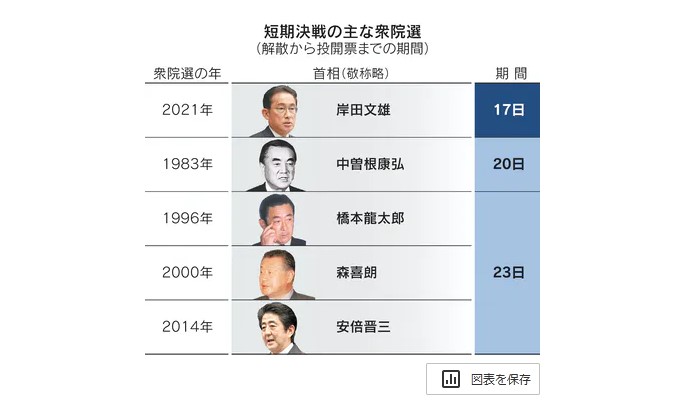 衆院解散から投開票までわずか17日という期間も最も短い。中曽根康弘首相が解散日程を定めた83年の20日間を抜いた。小選挙区比例代表並立制になった96年以降で最短は23日で、2014年などの例がある。