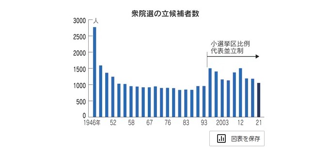 今回の衆院選の立候補者は1051人で、現行の小選挙区比例代表並立制になった1996年以降で最も少なくなった。このうち小選挙区には857人が出馬した。全体の競争率は2.3倍で、過去最低を記録した。