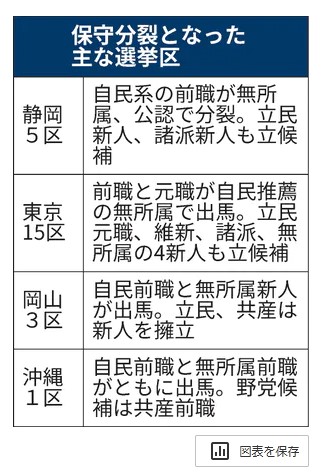 与党側が候補者を立てられなかったり、一本化できなかった選挙区も4つある。静岡5区は旧民主党で閣僚を務めた前職が自民入りをめざして無所属で出馬し、自民公認の前職と保守分裂になった。立民の候補らも届け出た。