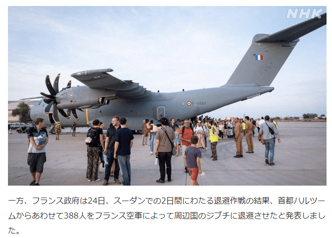 一方、フランス政府は24日、スーダンでの2日間にわたる退避作戦の結果、首都ハルツームからあわせて388人をフランス空軍によって周辺国のジブチに退避させたと発表しました。