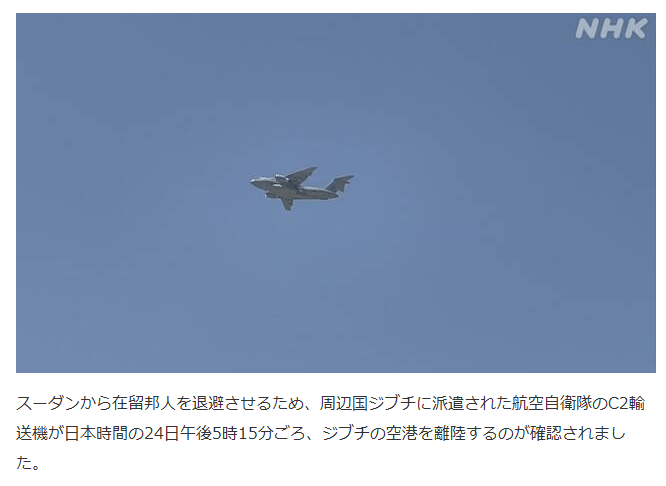 スーダンから在留邦人を退避させるため、周辺国ジブチに派遣された航空自衛隊のC2輸送機が日本時間の24日午後5時15分ごろ、ジブチの空港を離陸するのが確認されました。