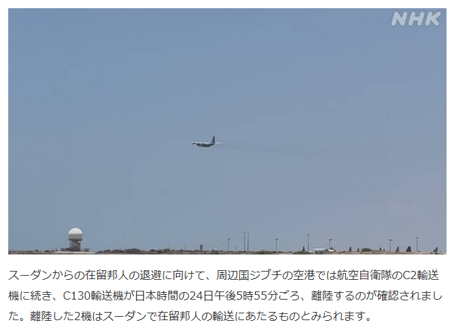 スーダンからの在留邦人の退避に向けて、周辺国ジブチの空港では航空自衛隊のC2輸送機に続き、C130輸送機が日本時間の24日午後5時55分ごろ、離陸するのが確認されました。