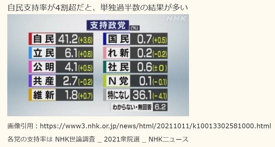 『自民支持率が4割超だと、単独過半数の結果が多い