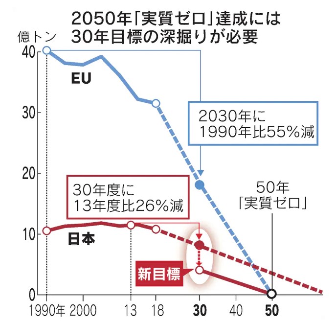 日本の現時点の30年目標は、安倍晋三前政権が15年に掲げた「13年度比で26%減」だ。首相は就任直後の20年10月に50年の脱炭素社会の実現を表明しており、現行の計画のままでは達成は難しい。