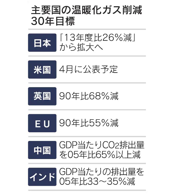 昨年、欧州連合(EU)が90年比で55%減、英国は同68%減と高い目標を掲げた。4月には米国やカナダも30年の目途を打ち出す方向だ。