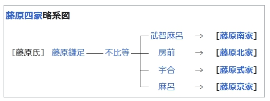 奈良時代に南家・北家・式家・京家の四家に分かれ、平安時代には北家が皇室と姻戚関係を結んで摂関政治を行った。